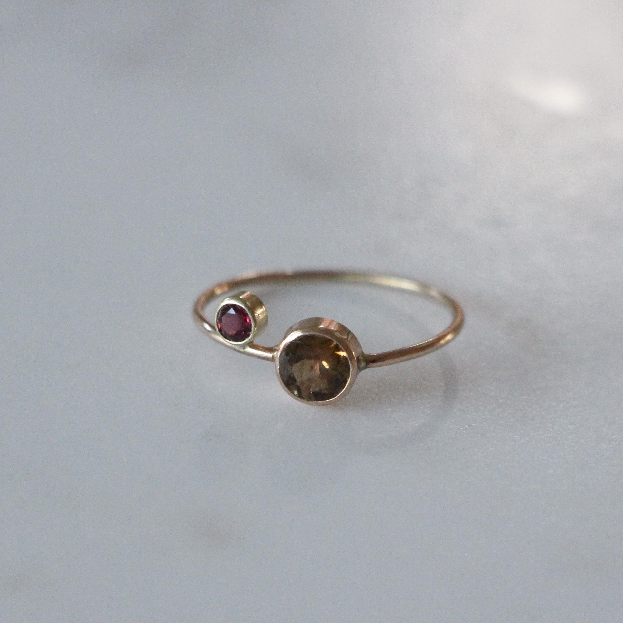 Ringen er lavet i 14karat guld kugletråd der 1 mm i tykkelsen. Har to turmaliner, den store i en gylden brun nuance og den lille i en mørk rosa nuance.