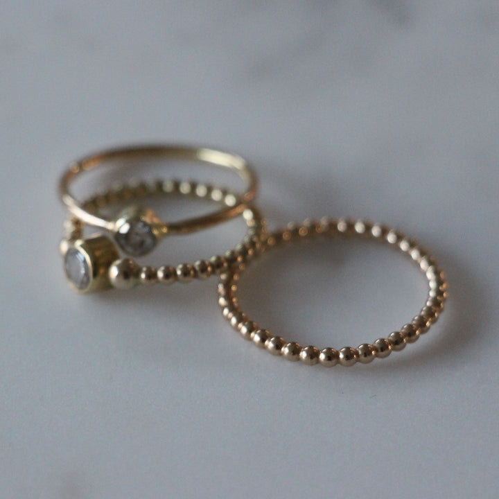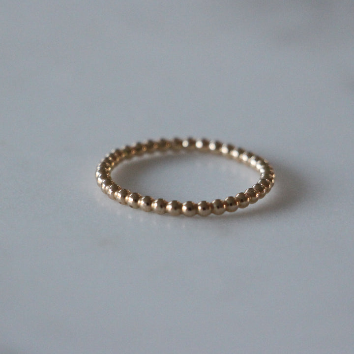 Ringen er lavet i 14karat guld kugletråd der 2 mm i tykkelsen. Fin at stacke med andre ringe, eller blot alene på en finger.