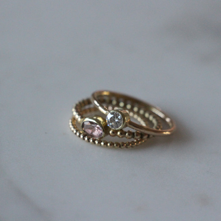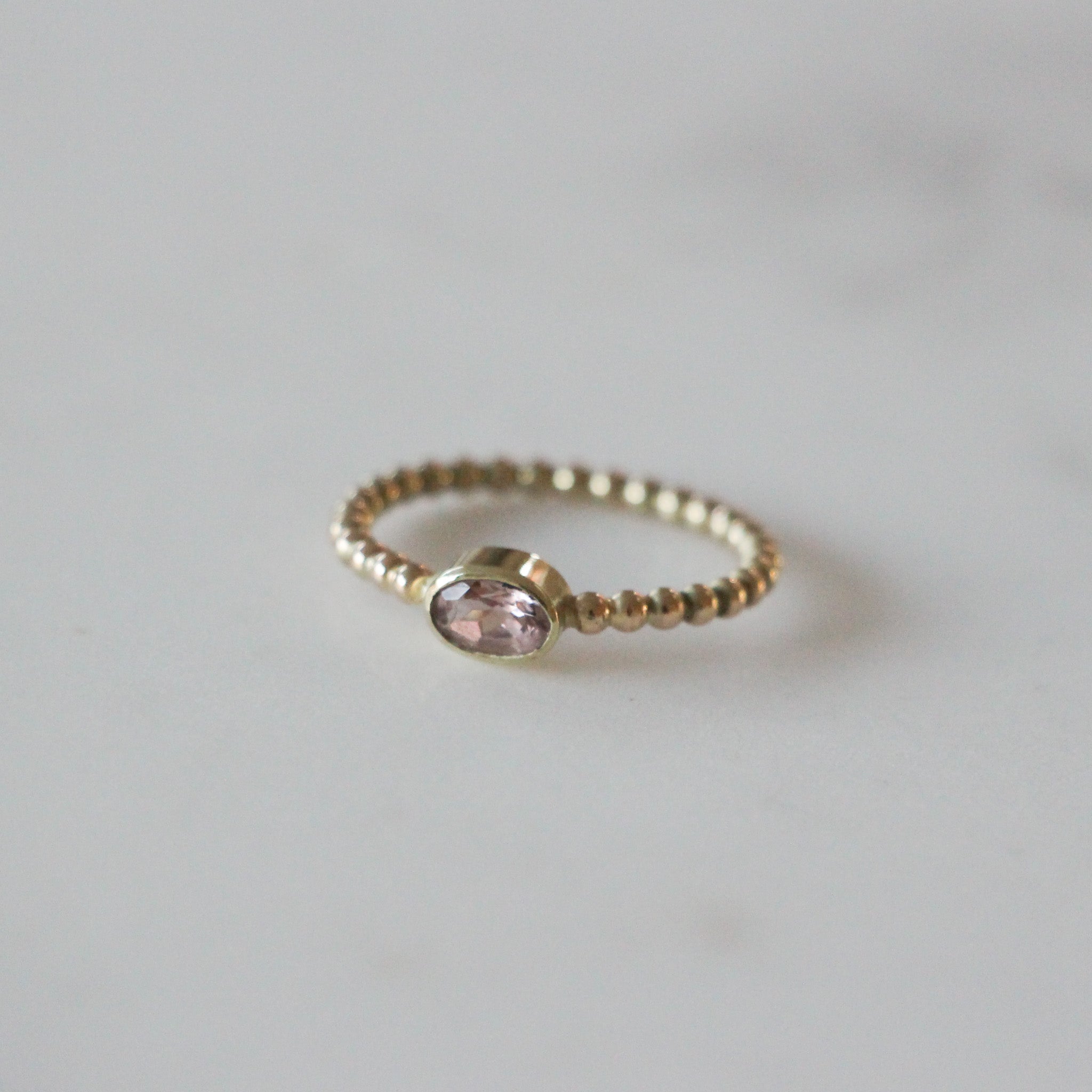 Er super fin at stacke med andre ringe som vist på billede 2. Ringen er lavet i massiv 14 karat guld kugletråd og med en 4x6 mm stor rosa morganit.